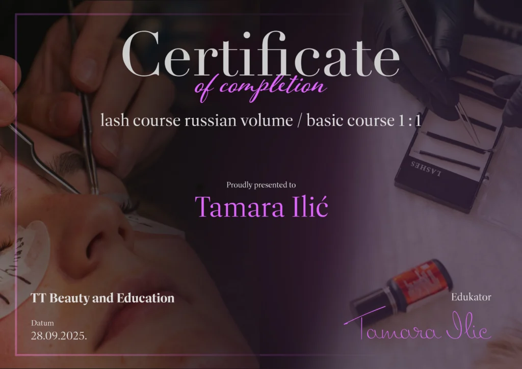 Zdravo! Ja sam Tamara Ilić, osnivač TT Beauty Education salona i sertifikovani lash artist sa višegodišnjim iskustvom u nadogradnji trepavica i velikim brojem odrzanih edukacija.Ljubav prema ovom poslu rodila se iz želje da svaka žena oseti koliko malo može značiti – a koliko mnogo promeniti – jedan detalj kao što su trepavice.